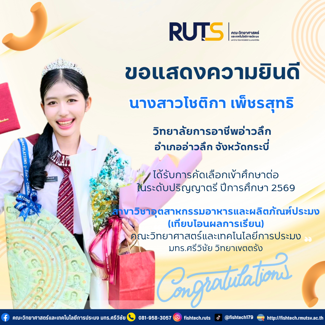 คณะวิทยาศาสตร์และเทคโนโลยีการประมง ยินดีต้อนรับและขอแสดงความยินดี กับ นางสาวโชติกา เพ็ชรสุทธิ นักศึกษาวิทยาลัยการอาชีพอ่าวลึก อำเภออ่าวลึก จังหวัดกระบี่ ผ่านการคัดเลือกเข้าศึกษาต่อระดับปริญญาตรี หลักสูตร 4 ปี ประจำปีการศึกษา 2569 ในสาขาวิชาอุตสาหกรรมอาหารและผลิตภัณฑ์ประมง (เทียบโอนผลการเรียน)