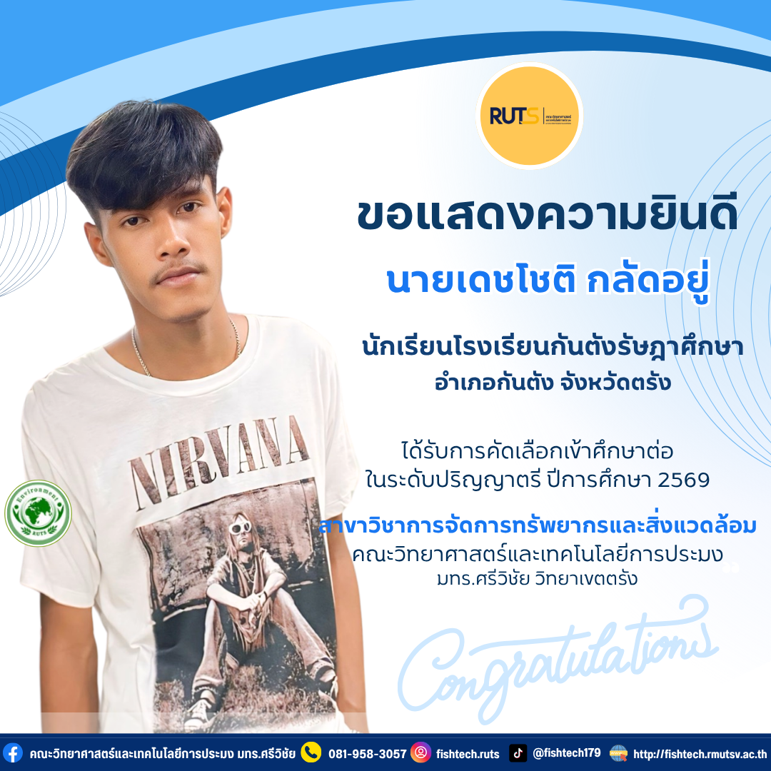 คณะวิทยาศาสตร์และเทคโนโลยีการประมง ยินดีต้อนรับและขอแสดงความยินดี กับ นายเดชโชติ กลัดอยู่ นักเรียนโรงเรียนกันตังรัษฎาศึกษา อำเภอกันตัง จังหวัดตรัง ผ่านการคัดเลือกเข้าศึกษาต่อระดับปริญญาตรี หลักสูตร 4 ปี ประจำปีการศึกษา 2569 ในสาขาวิชาการจัดการทรัพยากรและสิ่งแวดล้อม