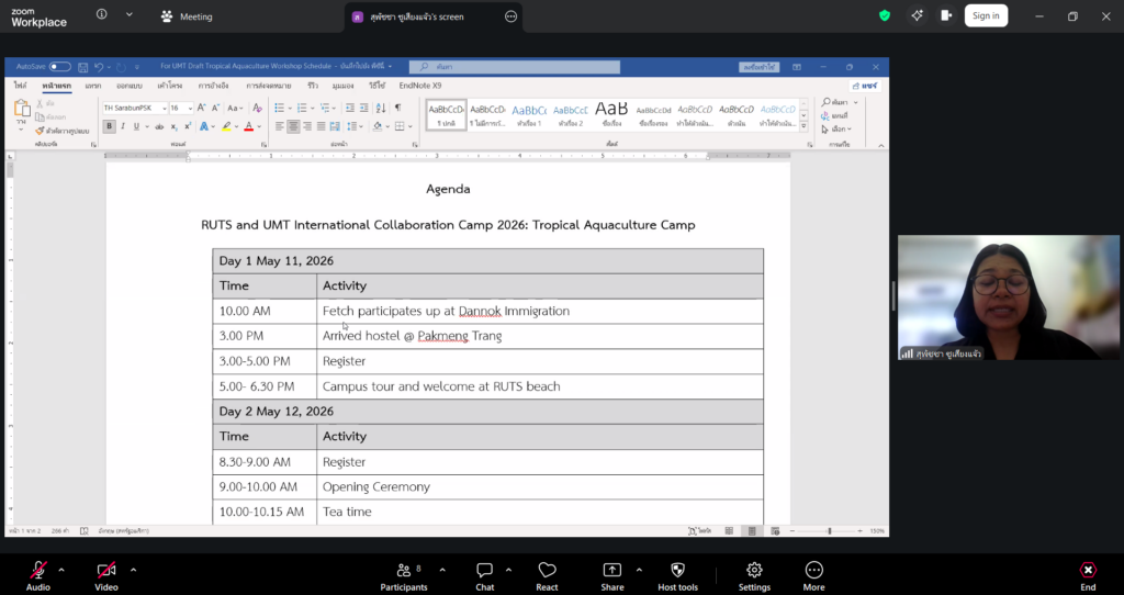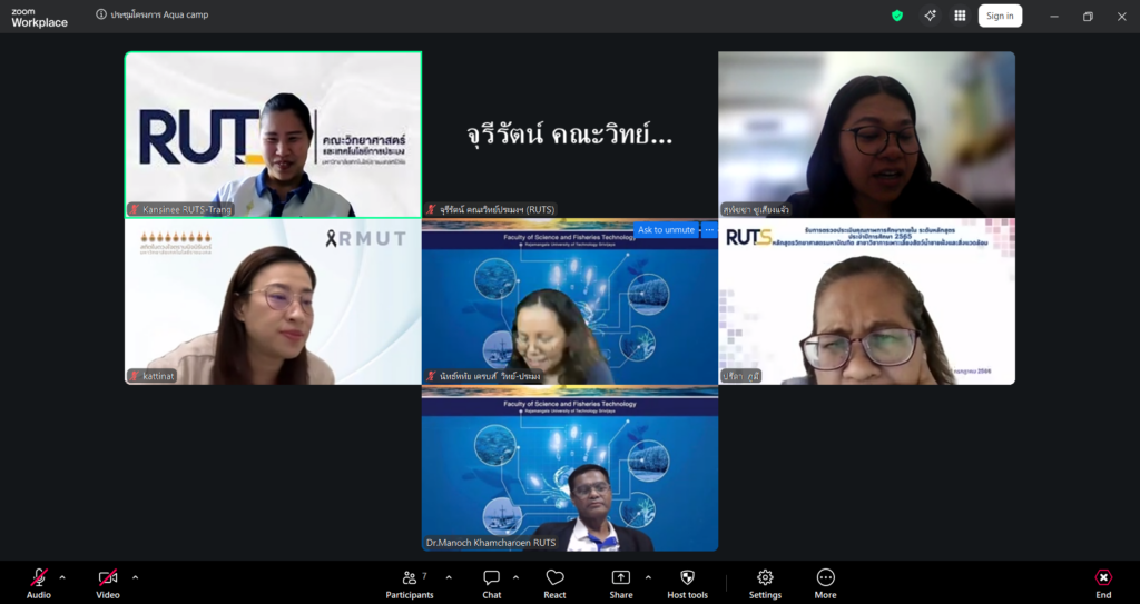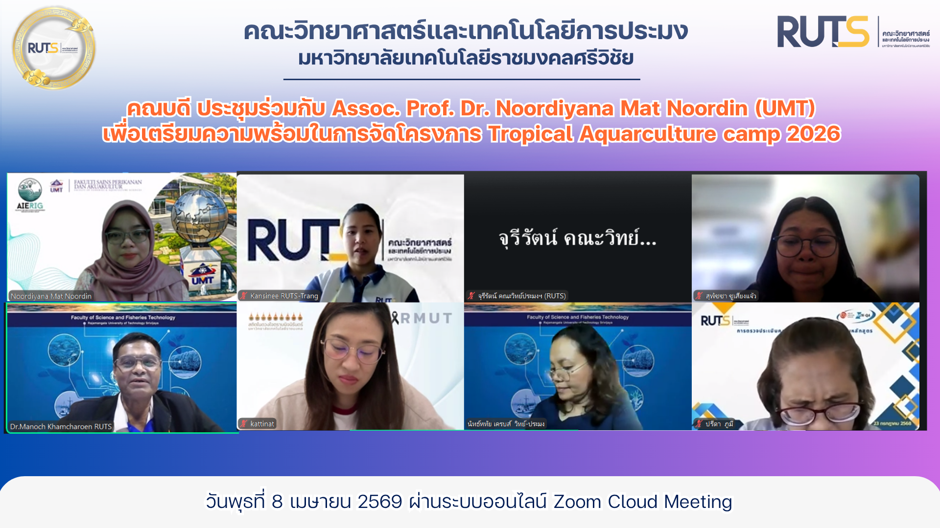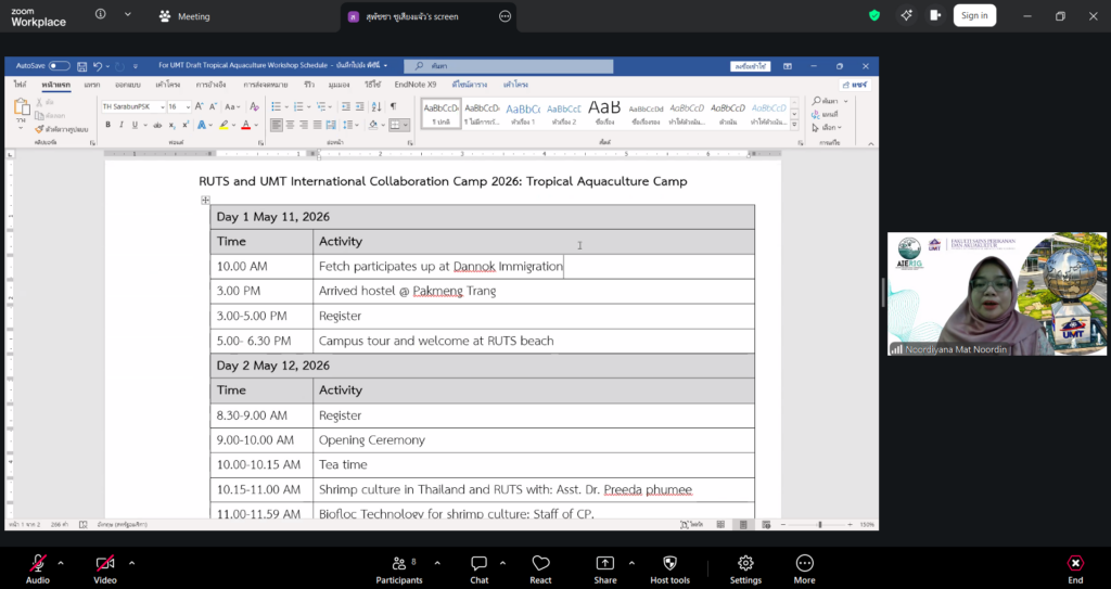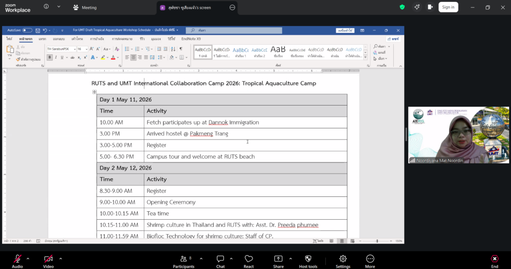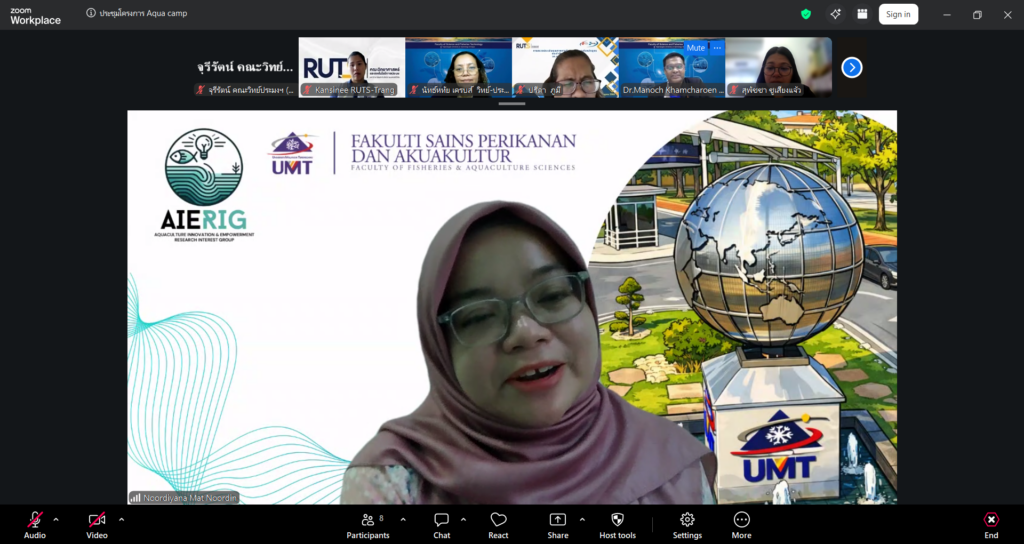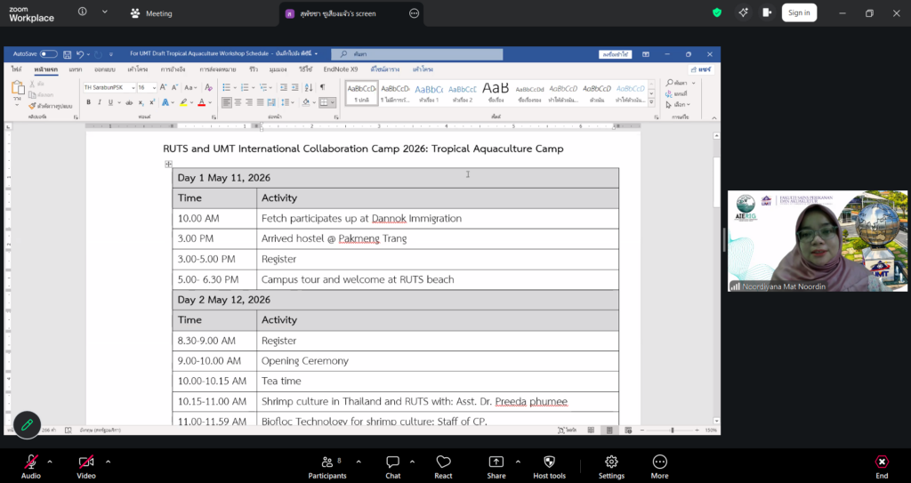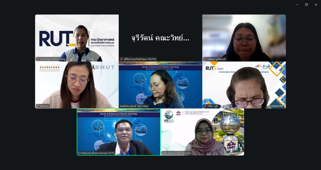 ผู้ช่วยศาสตราจารย์ ดร.มาโนช ขำเจริญ คณบดีคณะวิทยาศาสตร์และเทคโนโลยีการประมง พร้อมด้วย ดร.นัทธ์หทัย เครบส์ รองคณบดีฝ่ายวิชาการและวิจัย และคณาจารย์ เข้าประชุมร่วมกับ Assoc. Prof. Dr. Noordiyana Mat Noordin จาก Faculty of Fishteries & Aquaculture Sciences Universiti Malaysia Terengganu (UMT) เพื่อเตรียมความพร้อมในการจัดโครงการ Tropical Aquarculture camp 2026 ผ่านระบบออนไลน์ Zoom Cloud Meeting เมื่อวันพุธที่ 8 เมษายน 2569