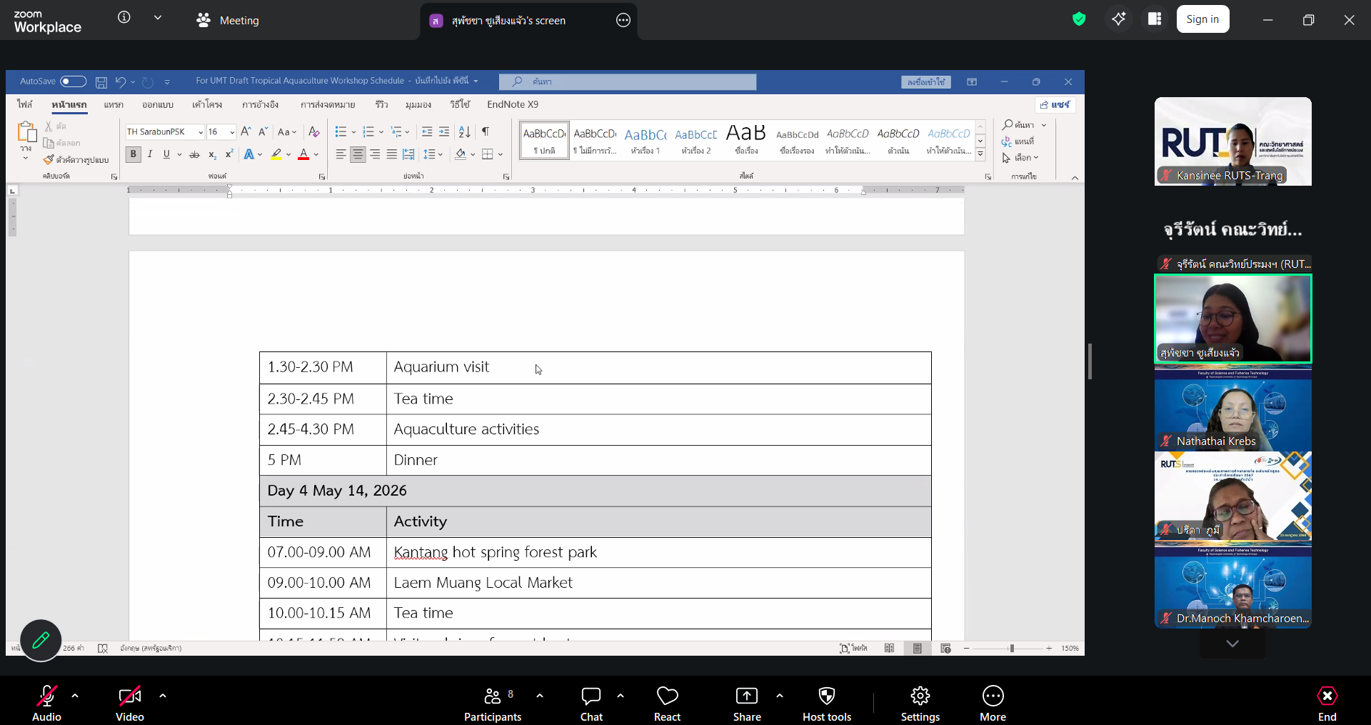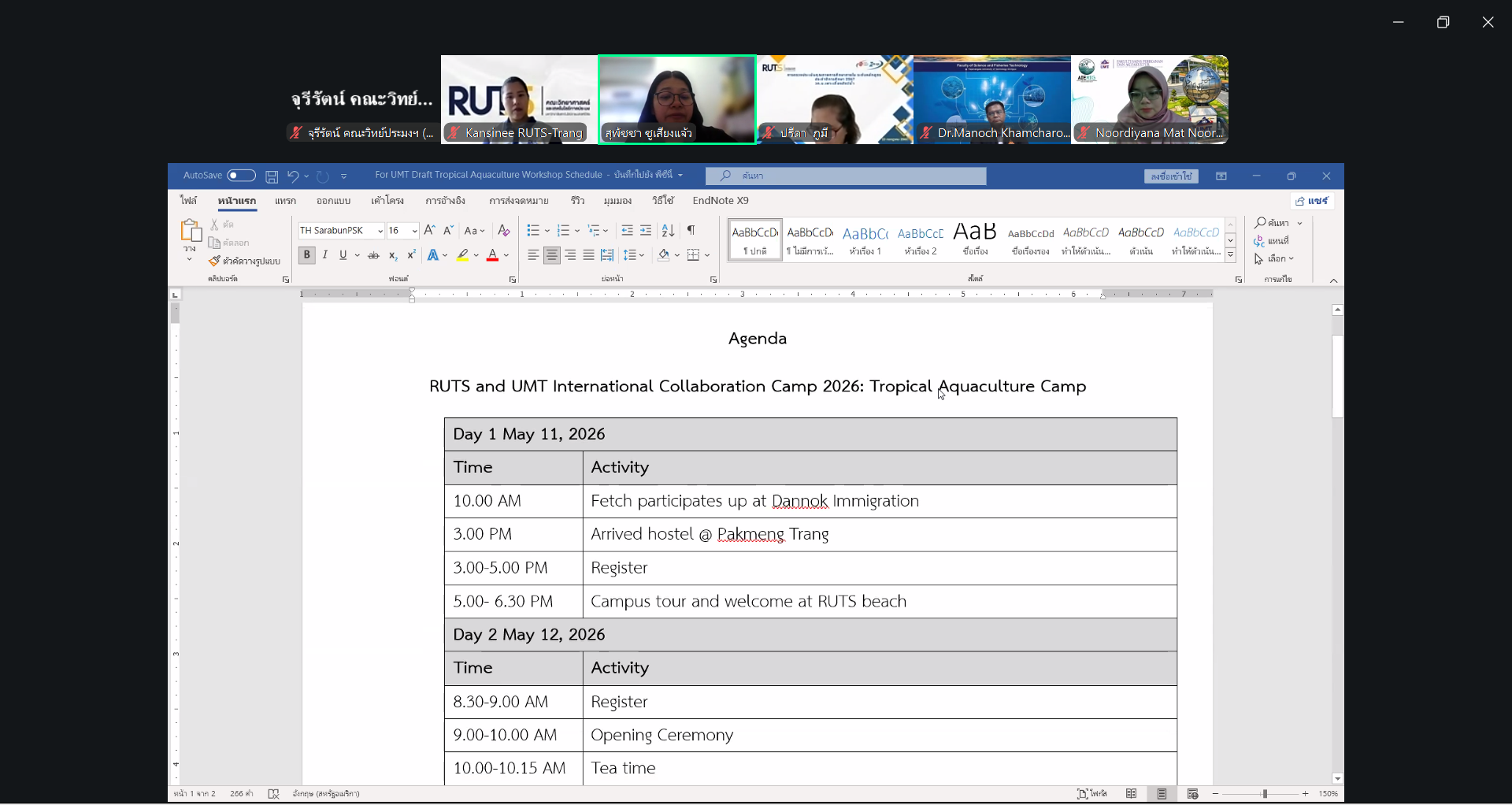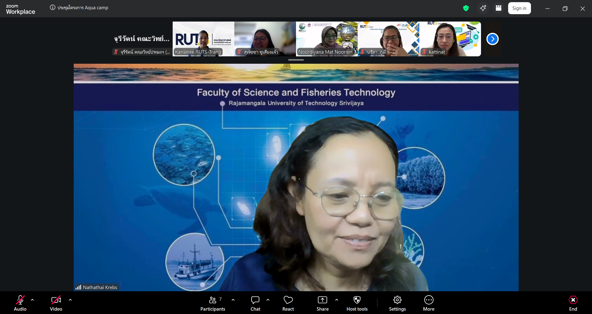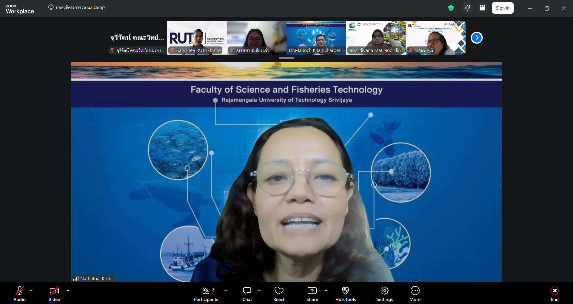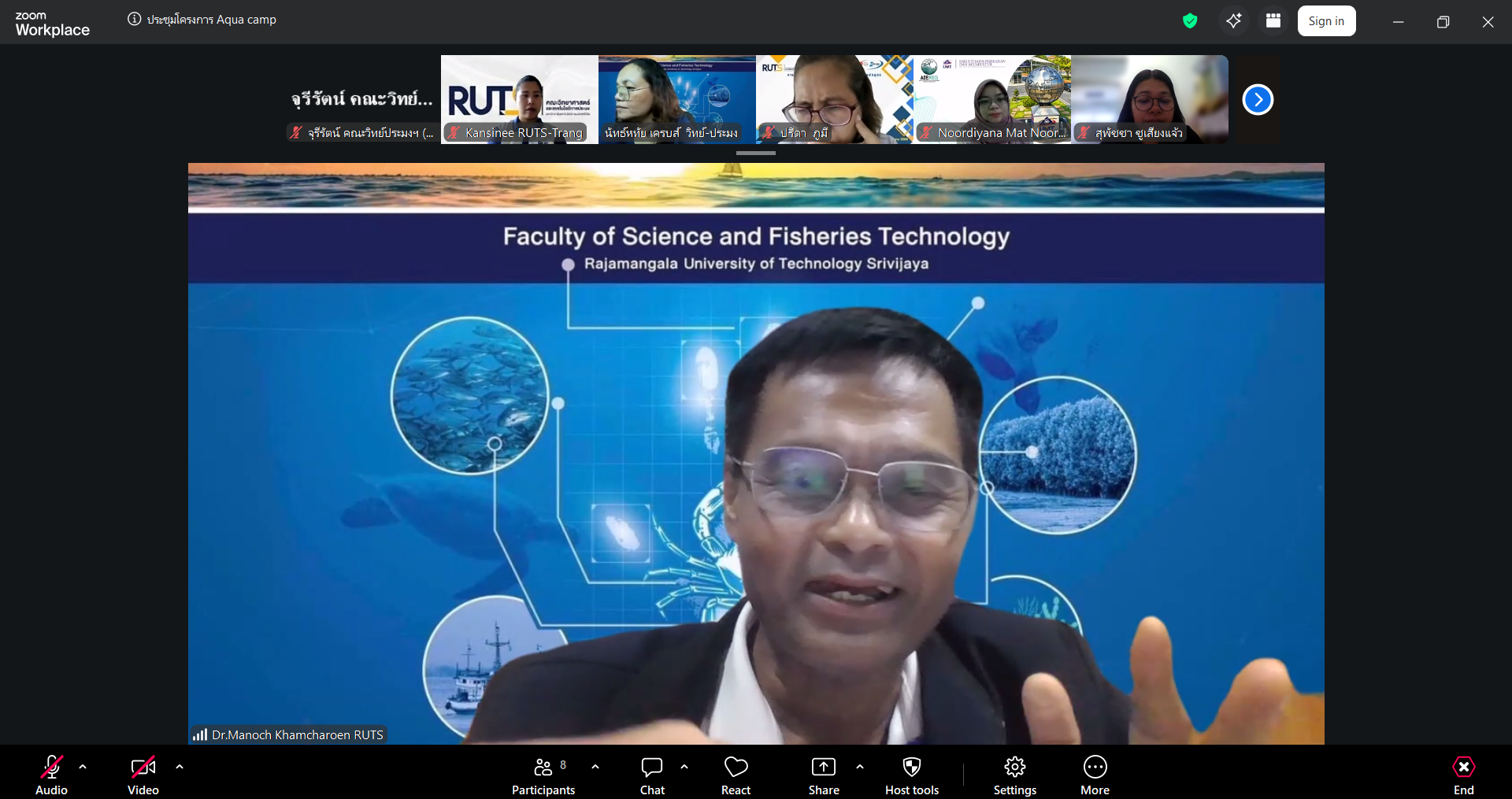 ผู้ช่วยศาสตราจารย์ ดร.มาโนช ขำเจริญ คณบดีคณะวิทยาศาสตร์และเทคโนโลยีการประมง พร้อมด้วย ดร.นัทธ์หทัย เครบส์ รองคณบดีฝ่ายวิชาการและวิจัย และคณาจารย์ เข้าประชุมร่วมกับ Assoc. Prof. Dr. Noordiyana Mat Noordin จาก Faculty of Fishteries & Aquaculture Sciences Universiti Malaysia Terengganu (UMT) เพื่อเตรียมความพร้อมในการจัดโครงการ Tropical Aquarculture camp 2026 ผ่านระบบออนไลน์ Zoom Cloud Meeting เมื่อวันพุธที่ 8 เมษายน 2569