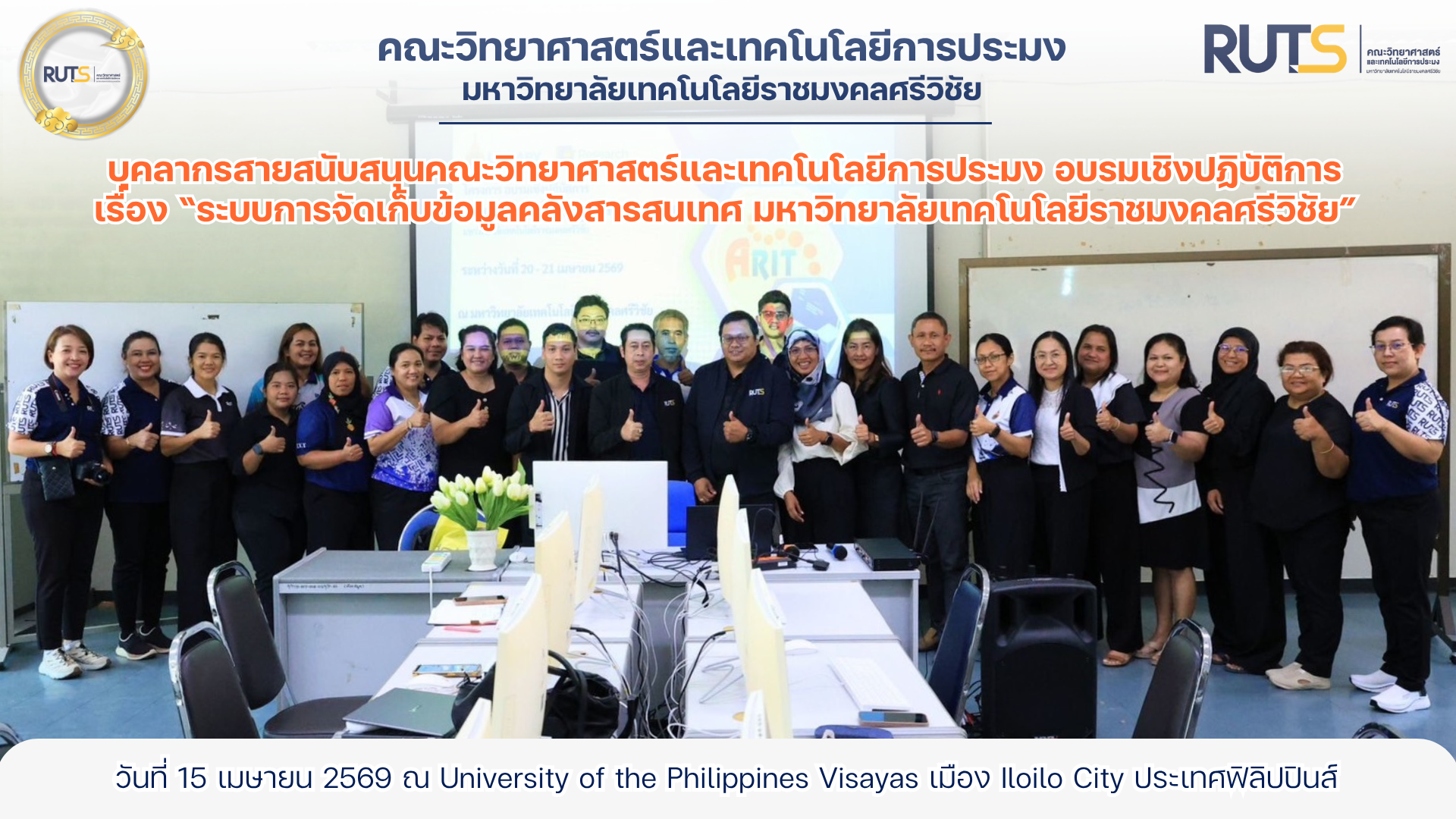 สำนักวิทยบริการและเทคโนโลยีสารสนเทศ มหาวิทยาลัยเทคโนโลยีราชมงคลศรีวิชัย จัดโครงการอบรมเชิงปฏิบัติการ เรื่อง “ระบบการจัดเก็บข้อมูลคลังสารสนเทศ มหาวิทยาลัยเทคโนโลยีราชมงคลศรีวิชัย” โดยมีบุคลากรสายสนับสนุนจากคณะวิทยาศาสตร์และเทคโนโลยีการประมงเข้าร่วมการอบรม