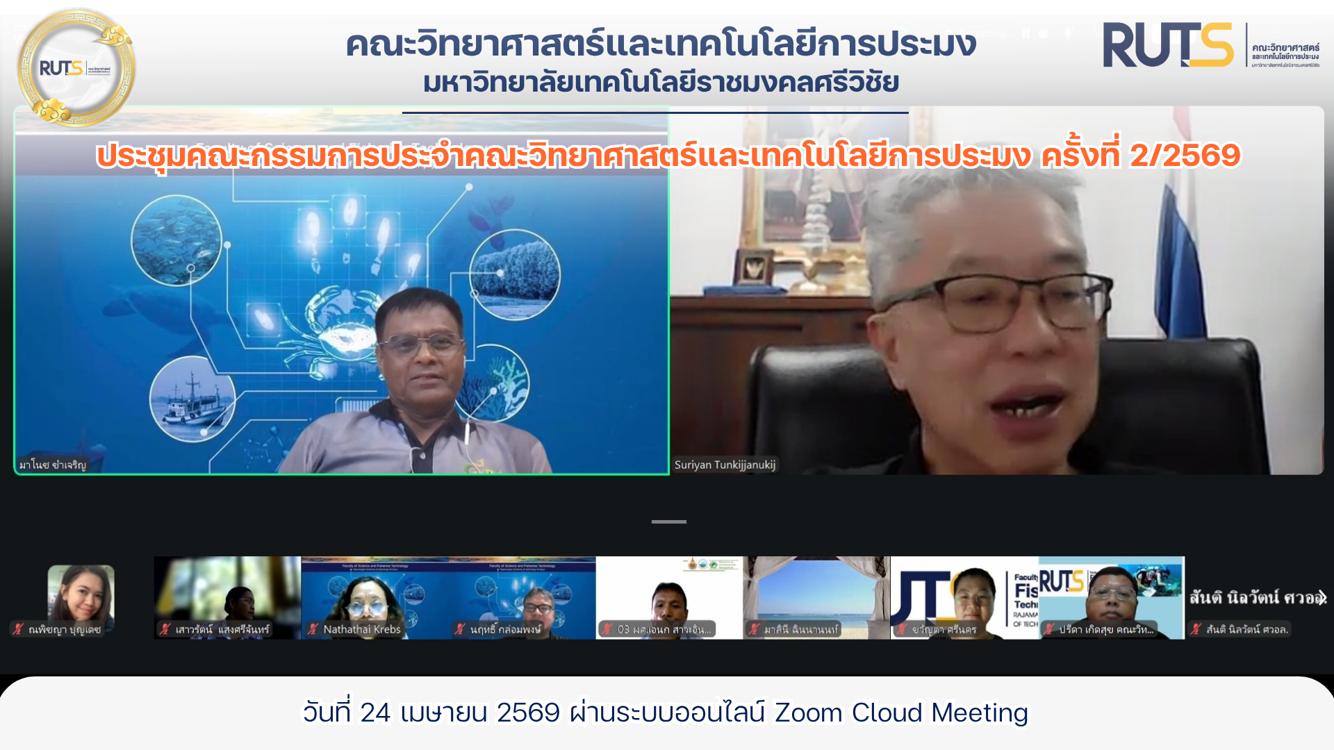 คณะวิทยาศาสตร์และเทคโนโลยีการประมง มหาวิทยาลัยเทคโนโลยีราชมงคลศรีวิชัย ได้จัดการประชุมคณะกรรมการประจำคณะวิทยาศาสตร์และเทคโนโลยีการประมง ครั้งที่ 2/2569 โดยมี ผู้ช่วยศาสตราจารย์ ดร.มาโนช ขำเจริญ คณบดีคณะวิทยาศาสตร์และเทคโนโลยีการประมง เป็นประธานในการประชุม