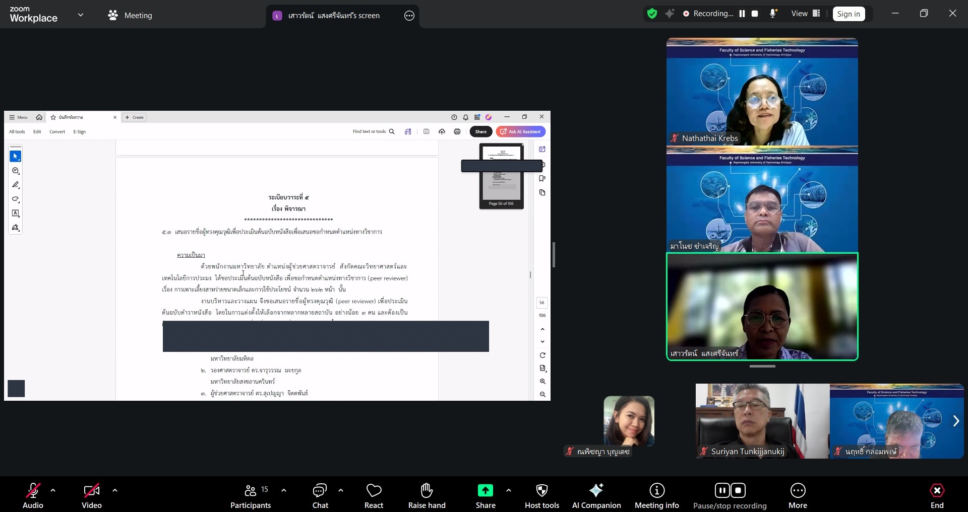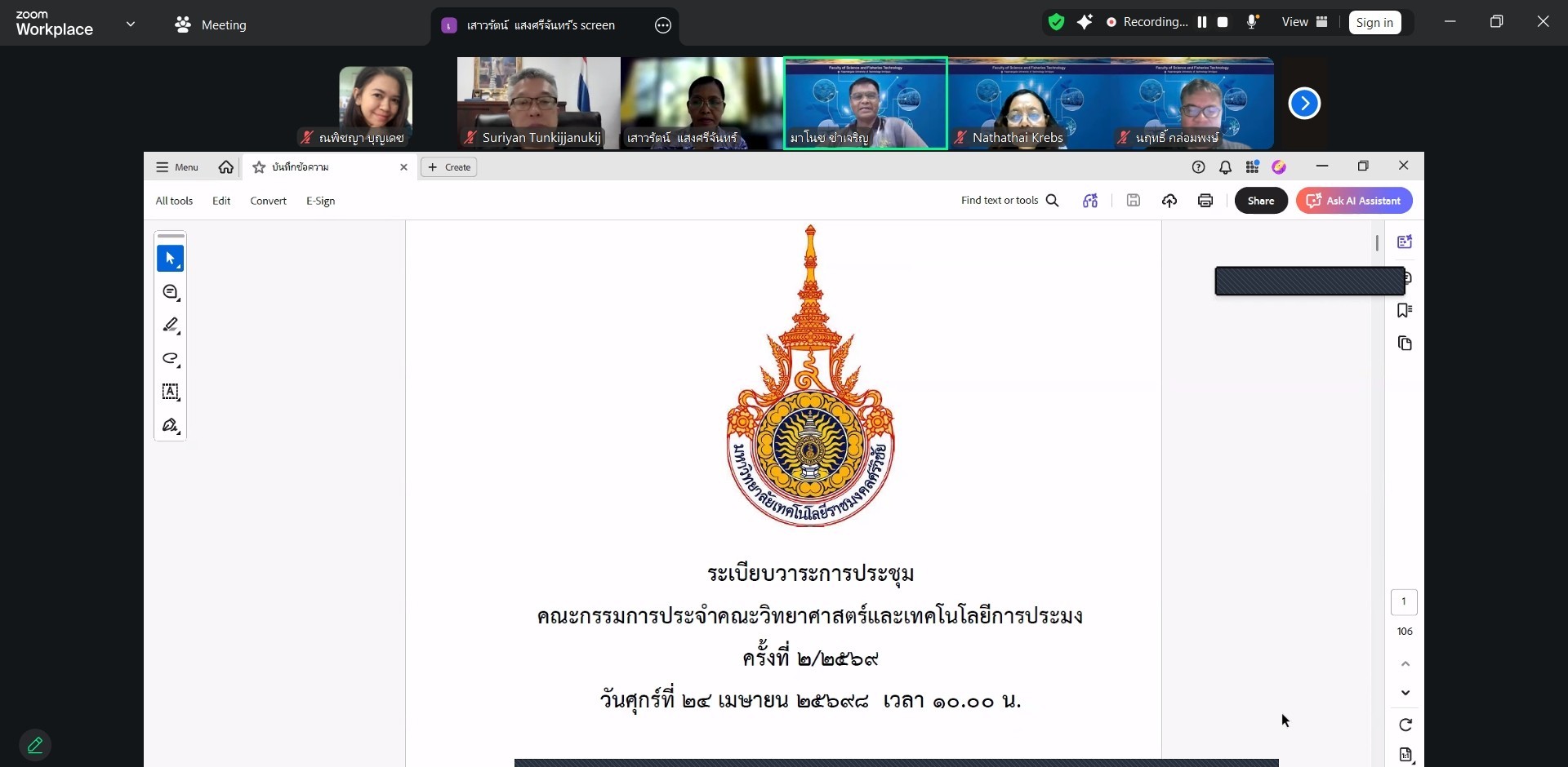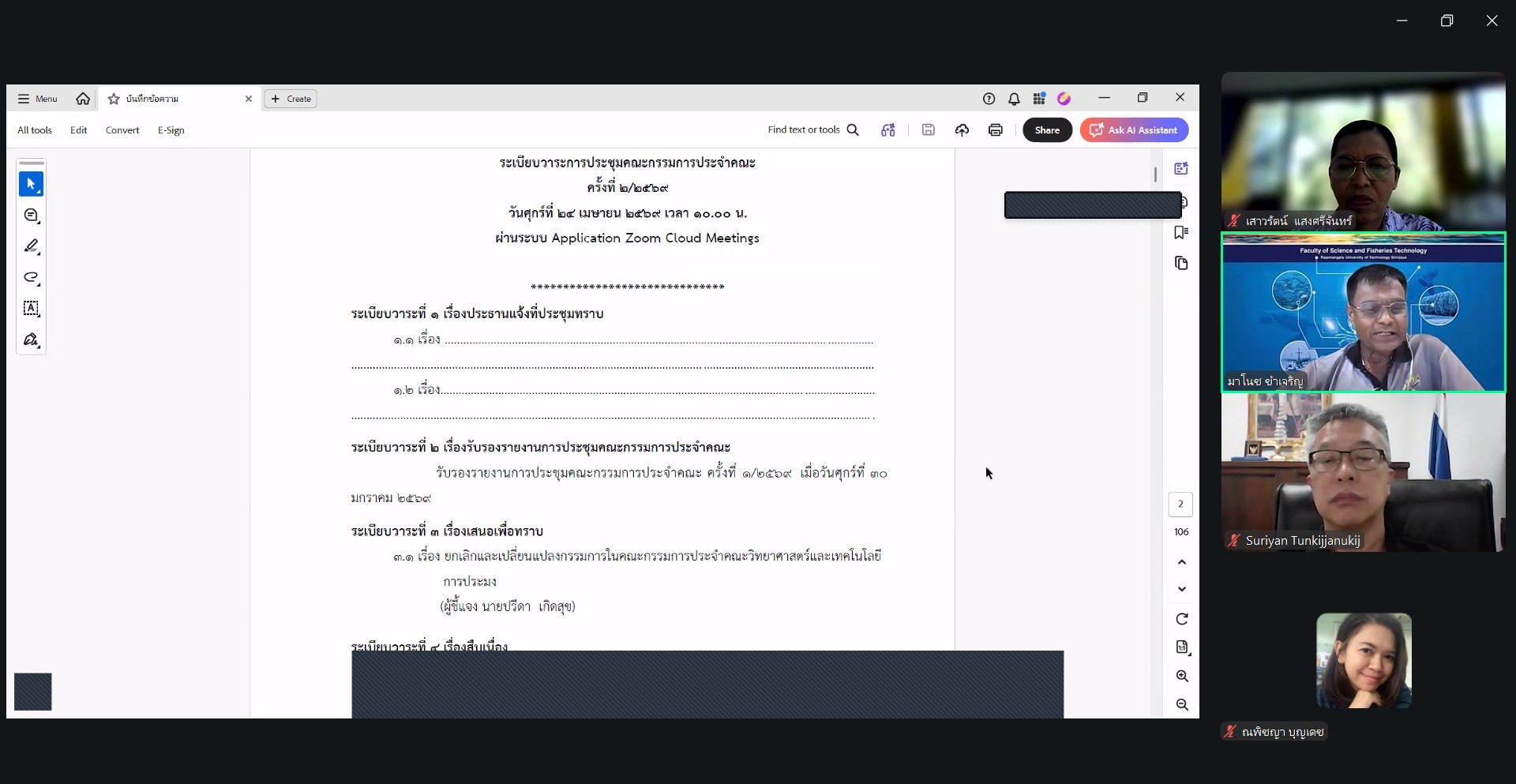 ในการนี้ มีคณะผู้บริหารและคณะกรรมการประจำคณะฯ เข้าร่วมการประชุมอย่างพร้อมเพรียง เพื่อร่วมกันพิจารณาแนวทางการดำเนินงาน การบริหารจัดการ และการขับเคลื่อนภารกิจของคณะฯ ให้เป็นไปตามนโยบายของมหาวิทยาลัยอย่างมีประสิทธิภาพ การประชุมจัดขึ้นในวันศุกร์ที่ 24 เมษายน 2569 ผ่านระบบออนไลน์ Zoom Cloud Meeting